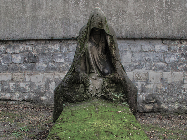 Whatever it is, suffice it say that I can’t improve on this one by over explaining it. Obviously it’s another grave at Pere Lachaise Cemetery in Paris, and obviously it’s a woman (maybe an angel?) sitting covered, barefoot, atop a grave, head bowed down with her gaze lowered to meet the spot where the deceased’s eyes would be. She had been lovingly carved out of stone that over time has found itself covered in moss to make the effect even more haunting. That cold stone sporting a layer of living bright green moss, the hope intrinsic in it as well…not sure how to finish this sentence.